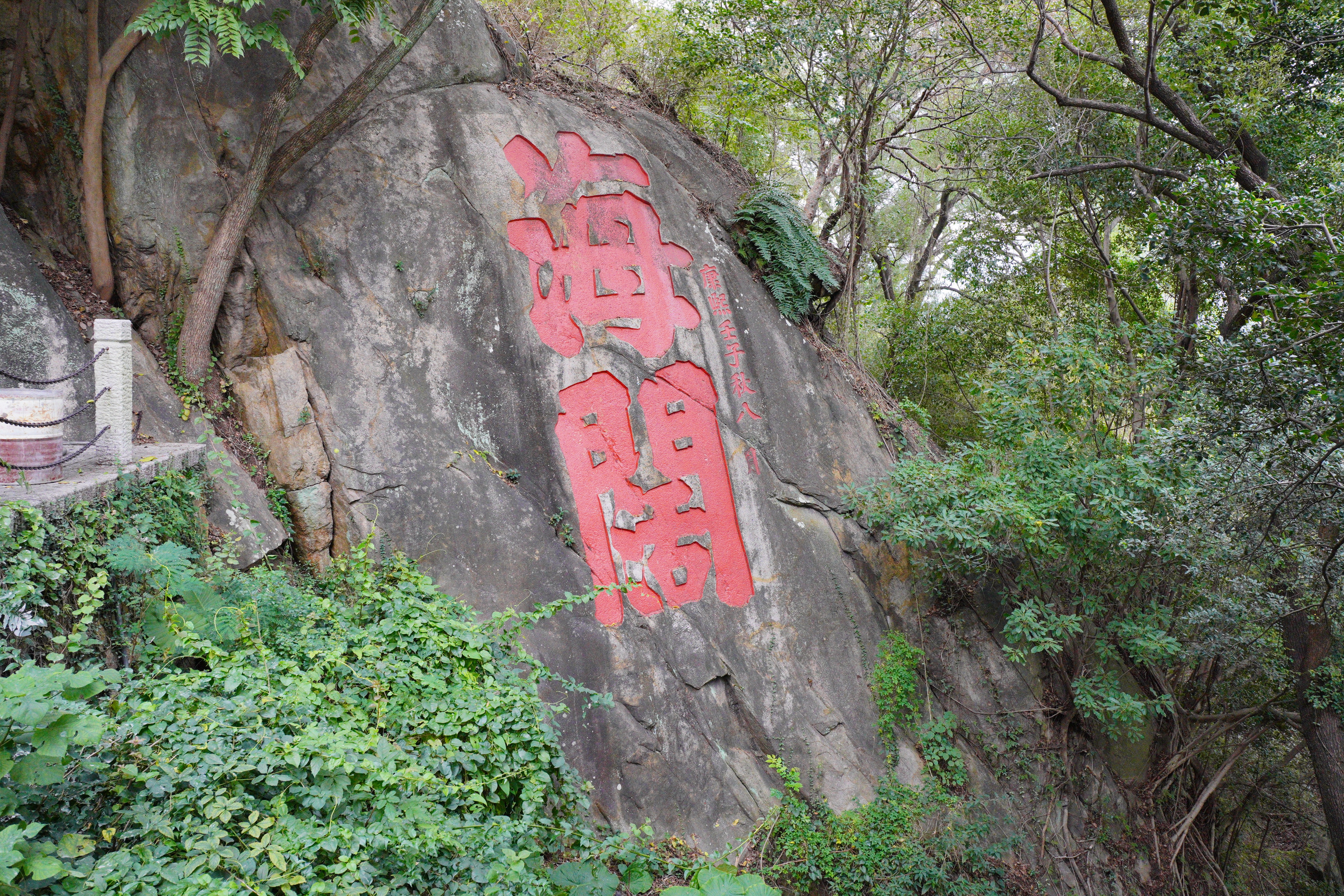 楷书,纵2行,正文字高2.7米,宽2.2米;旁款字径约35厘米,是乌山上体量最大的摩崖石刻。