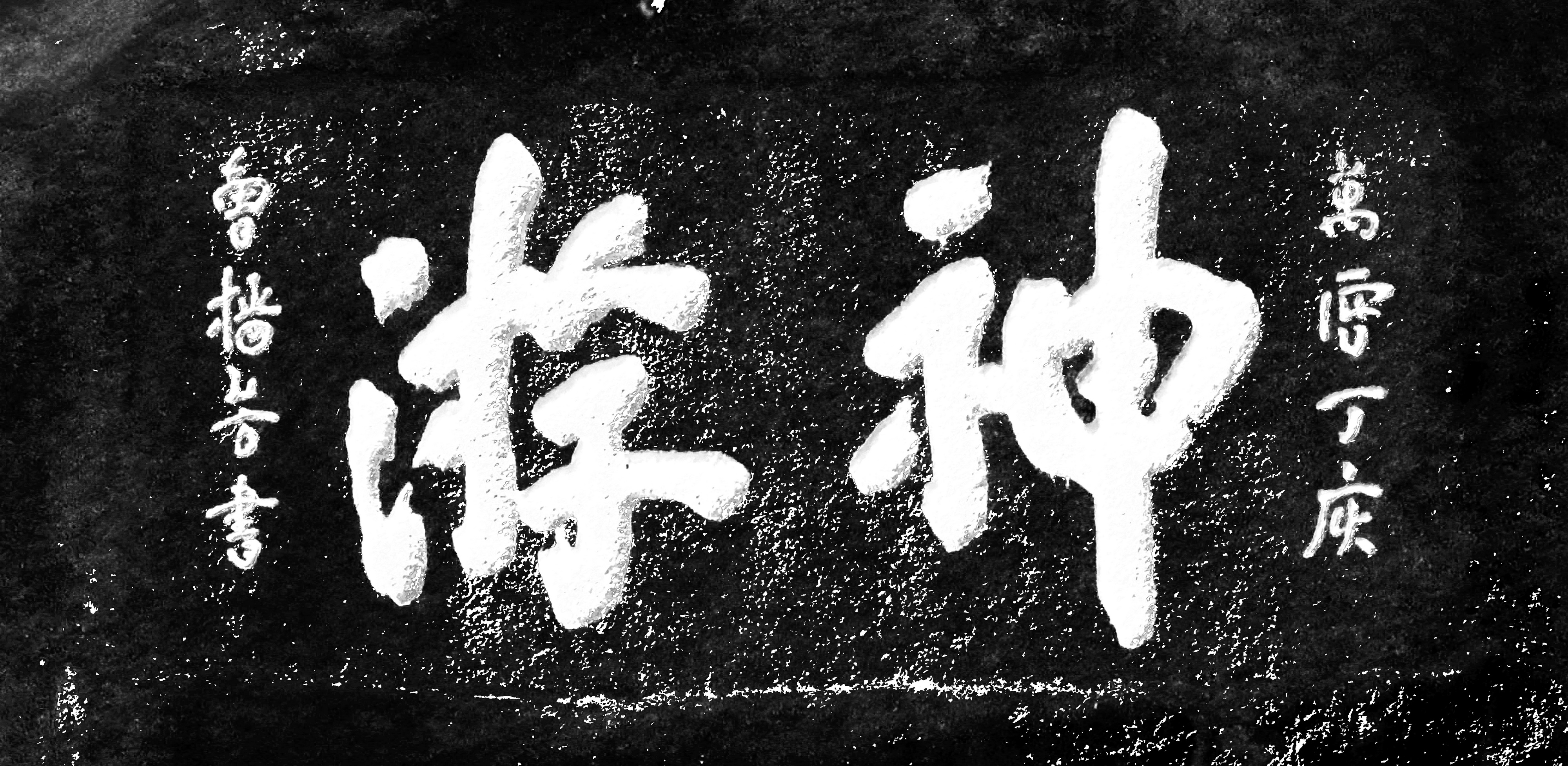 “神游”二字是唐代褚遂良体的行书,字体自然、布阵疏朗、笔势苍劲有力。
