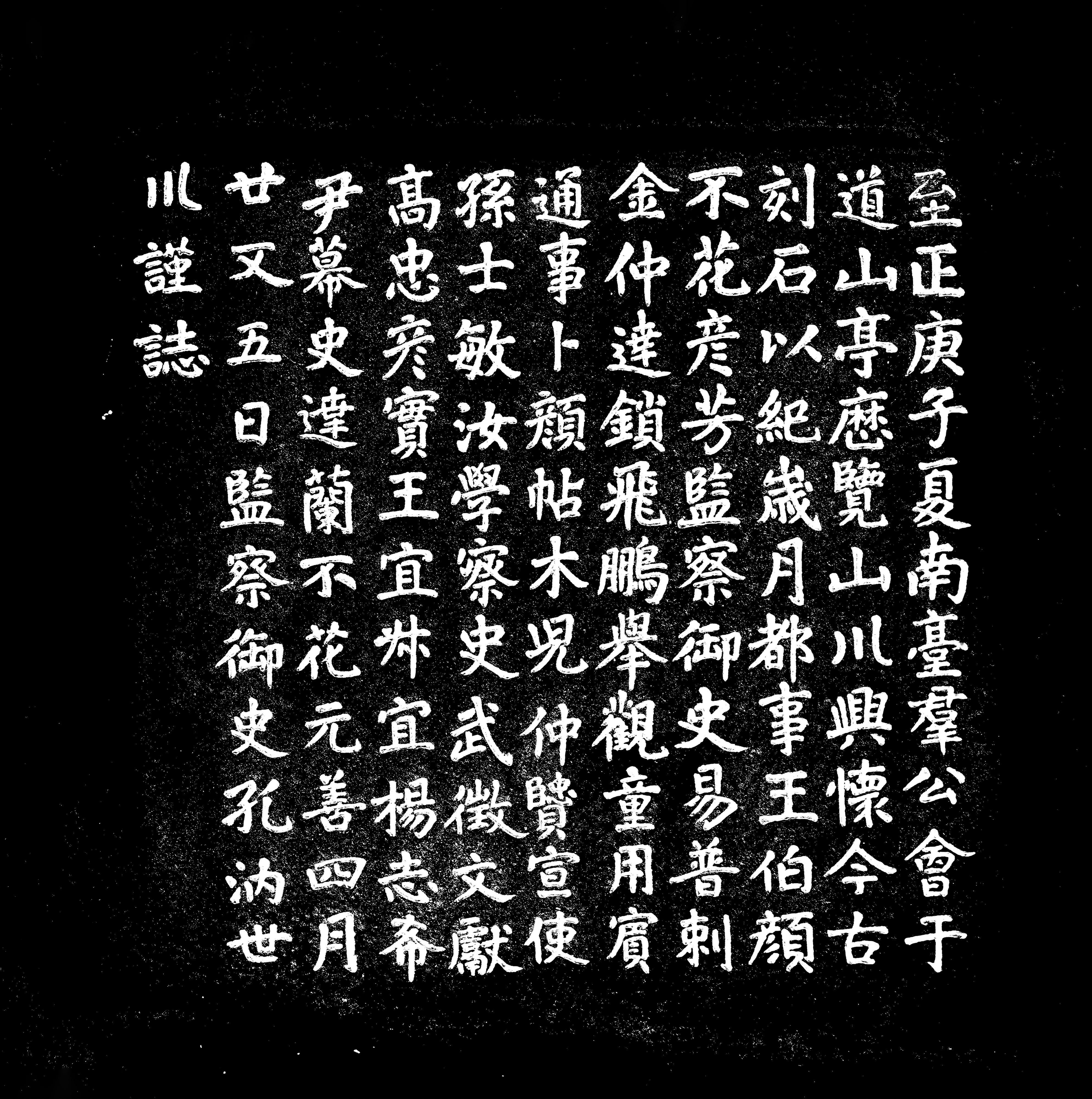 题字:至正庚子夏,南台群公会于道山亭,历览山川,兴怀今古,刻石以纪岁月。都事王伯颜不花彦芳,监察御史易普刺金仲达、锁飞鹏举、观童用宾,通事卜颜贴木儿仲贤,宣使孙士敏汝学,察史武徵文献、高忠彦实、王宜叔宜、杨志希尹,幕史达兰不花元善。四月廿又五日,监察御史孔汭世川谨志。