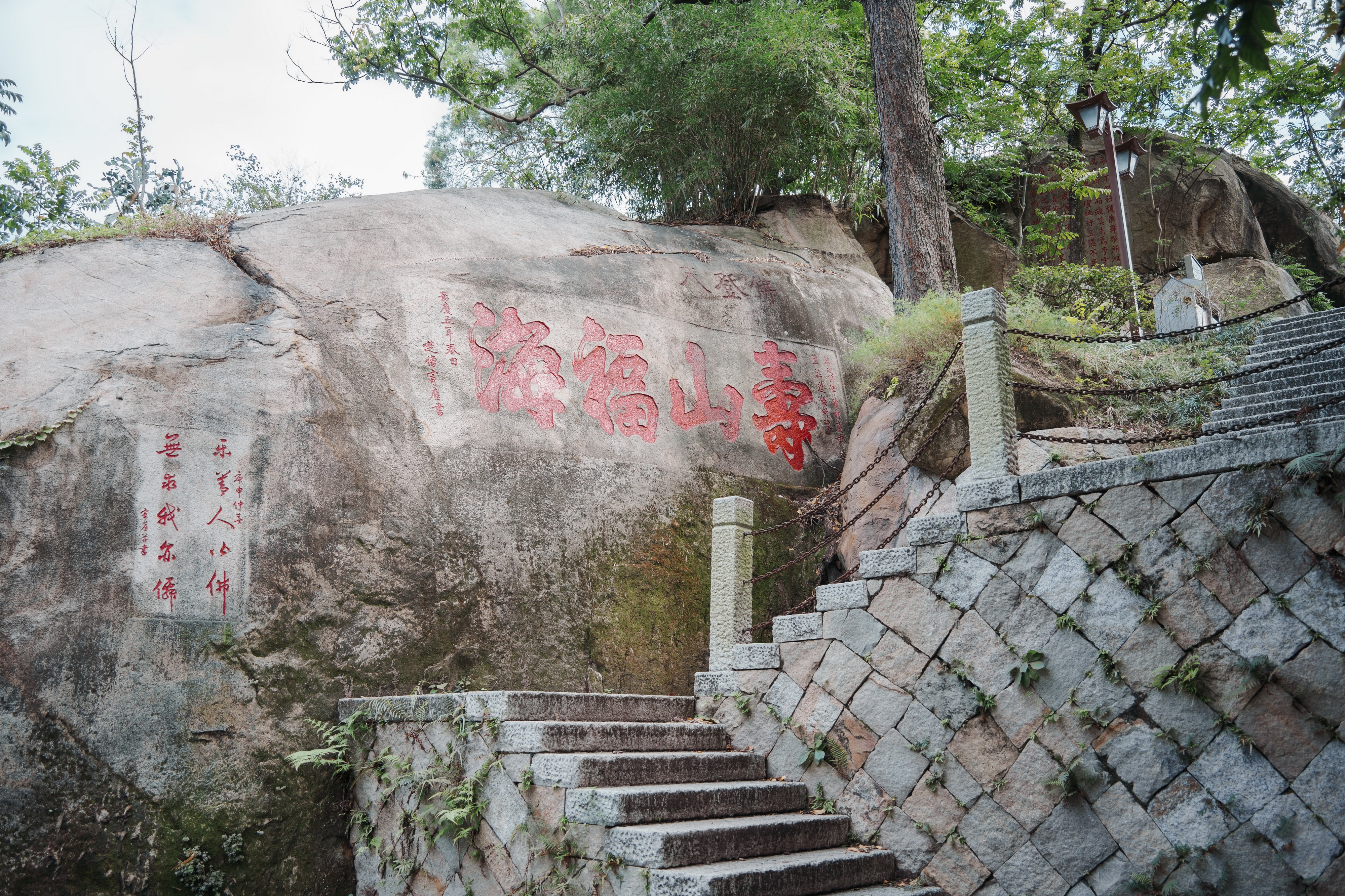 当时的镇闽将军庆霖在获悉寄尘和尚挂锡蛰居乌山时,便慕名拜访他,两人彻夜长谈,引为知己,并成为方外之交。寄尘便为其写大型榜书“寿山福海”,让人镌刻在乌山邻霄台下的摩崖上,并在其左下方刻上小字佛偈“乐善人皆佛,无求我亦仙。”